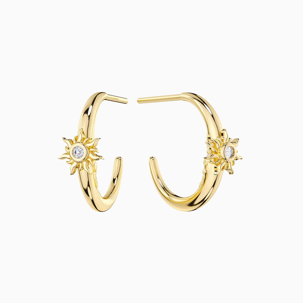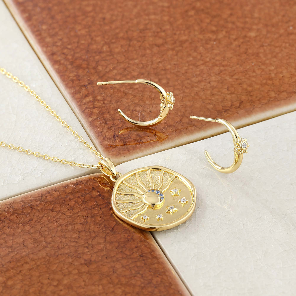 The Celestial Harmony Half Hoop Stud Earrings capture the harmony of light and dark, inspired by the fourth day of creation. On the outer front, a radiant sun motif shines, symbolizing life-giving energy and warmth. Hidden within the inner curve lies a subtle moon, embodying tranquility and mystery. Together, they represent the celestial rhythm of day and night, a reminder of life’s delicate balance. These earrings offer an elegant statement for those who embrace both the vibrant and reflective aspects of their journey.