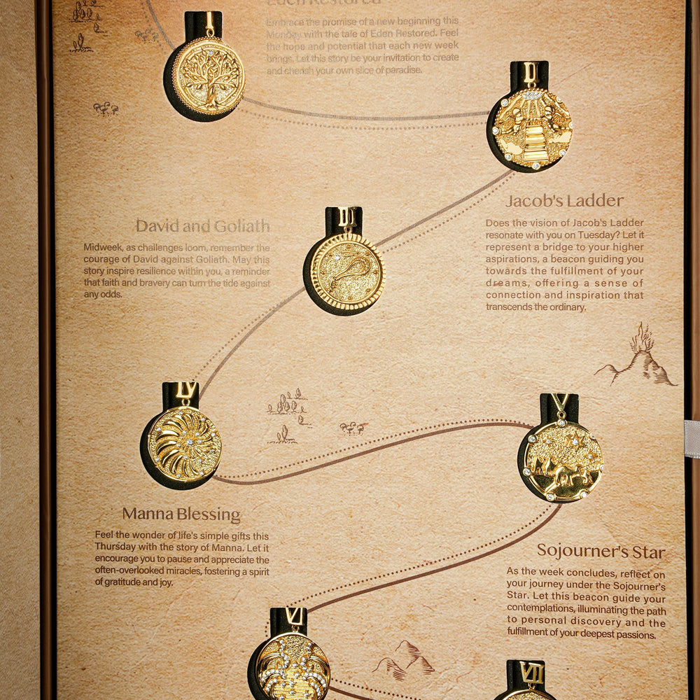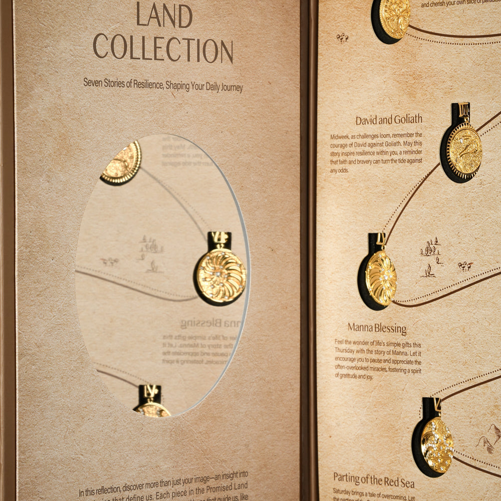 Celebrate the milestones of faith and life with the Promised Land Special Edition gift box from Vanimy Jewelry, uniquely crafted to commemorate our brand’s anniversary. This collector’s edition is elegantly designed like a book. Opening it reveals a reflective mirror on the left, encouraging you to discover insights into the stories that define us. On the right, seven medallion necklaces are prominently displayed, each accompanied by inspiring words for every day of the week, reflecting the resilience, hope, and spirit of their biblical narratives: