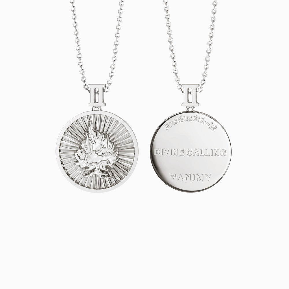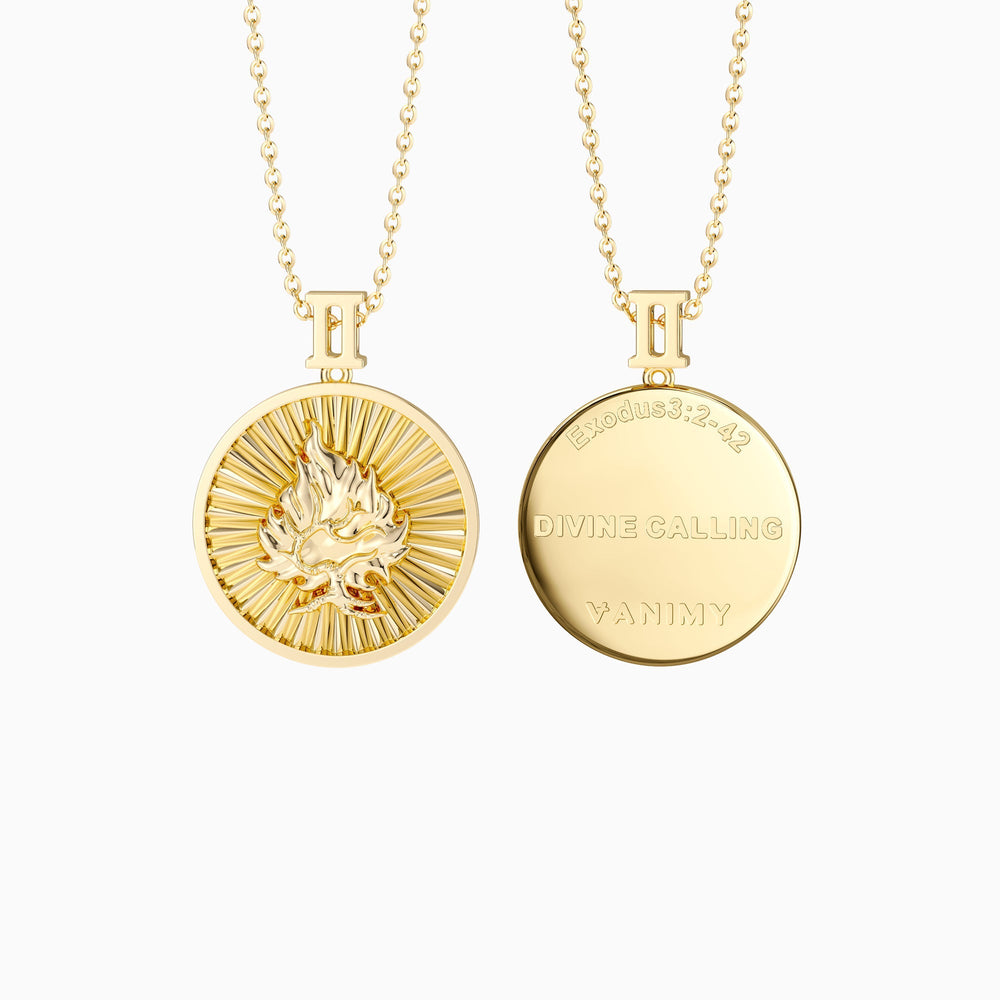 This necklace channels the transformative encounter Moses had with the Divine at the burning bush. In a solitary desert, a flame that consumed not sparked Moses' mission to lead his people to freedom. Etched on the reverse side is the verse and the heart of this tale: ‘Divine Calling'.