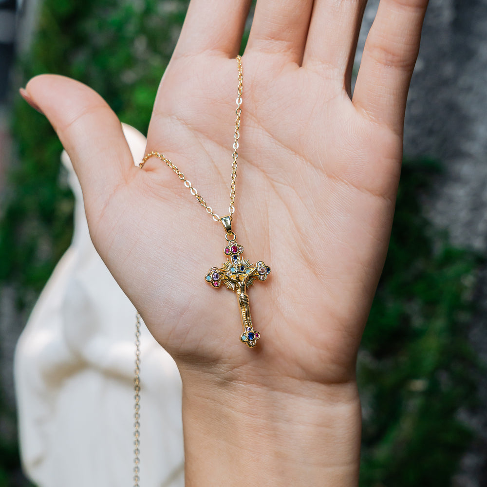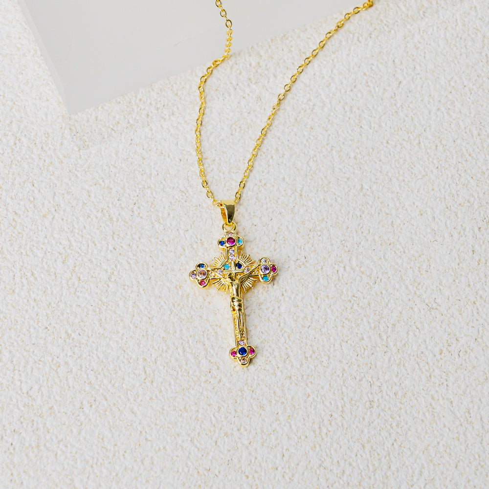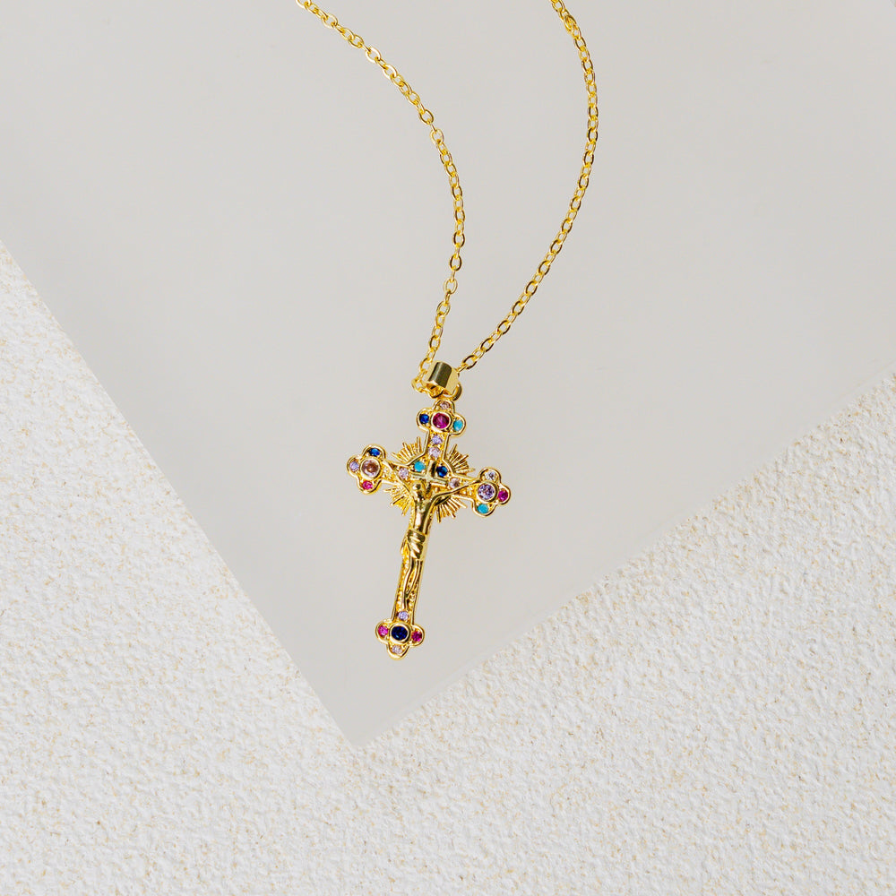 Intricately designed cross pendant with colorful gemstones symbolizing divine blessings