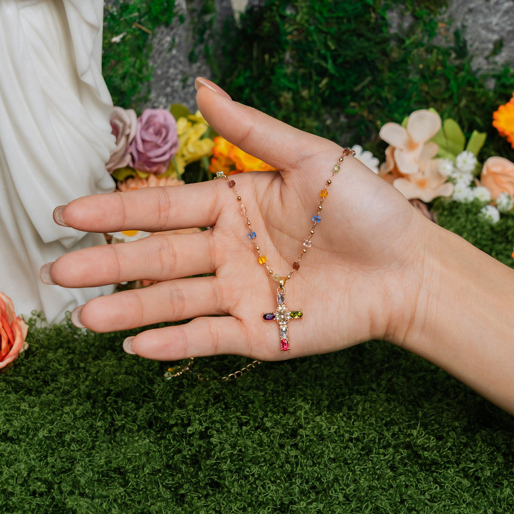 Each necklace features a gold-plated chain adorned with dazzling multicolor glass beads, leading to a stunning gemstone cross pendant — symbolizing divine light and eternal love.