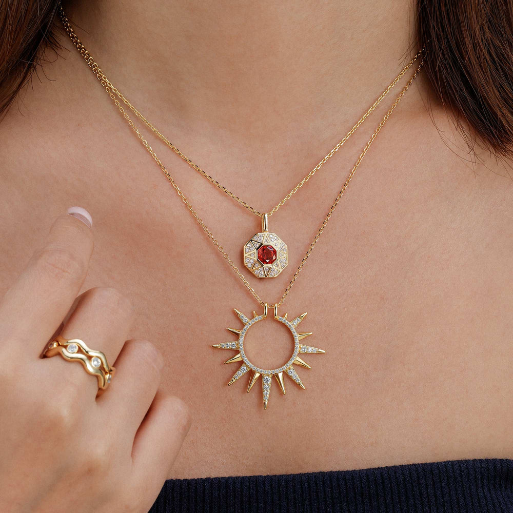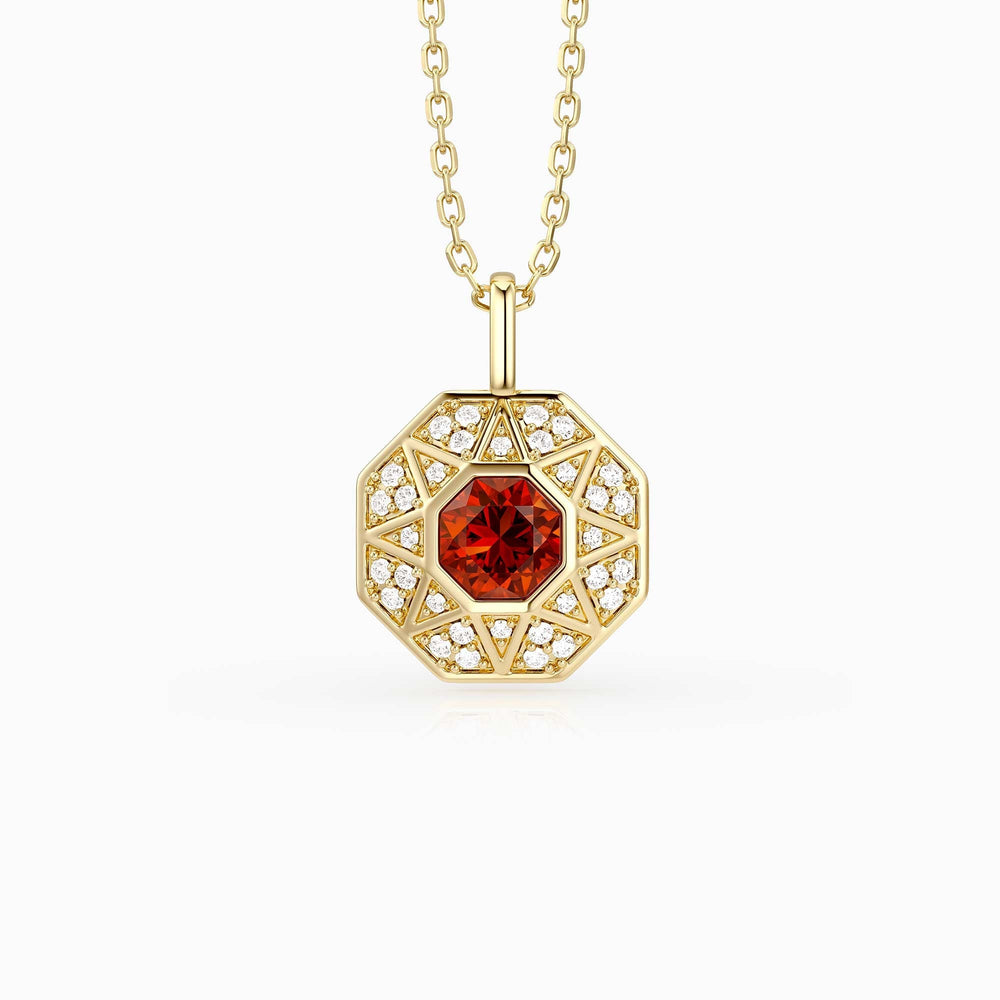 Geometric and intentional, this octagonal medallion honors the sacred gift of Self-Awareness and Truth. At its center glows a vivid spessartine-hued stone—evoking inner fire, courage, and the unshakable clarity that comes from living authentically. Surrounding it, radiant facets and light-catching pavé echo the quiet strength of a woman who knows her path and walks it fully.