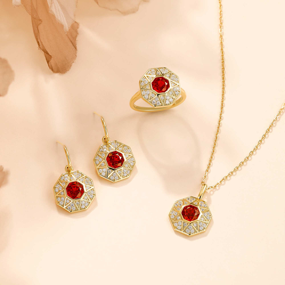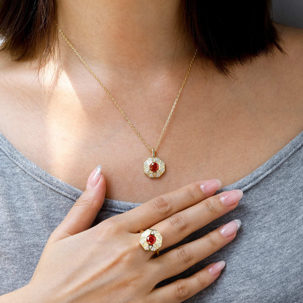 This radiant ring mirrors the octagonal medallion in form and spirit, honoring the sacred gift of Self-Awareness and Truth. At its heart, a fire-toned spessartine-hued stone burns with unmistakable clarity—surrounded by a starburst of pavé-set brilliance that catches light like conviction catches voice.