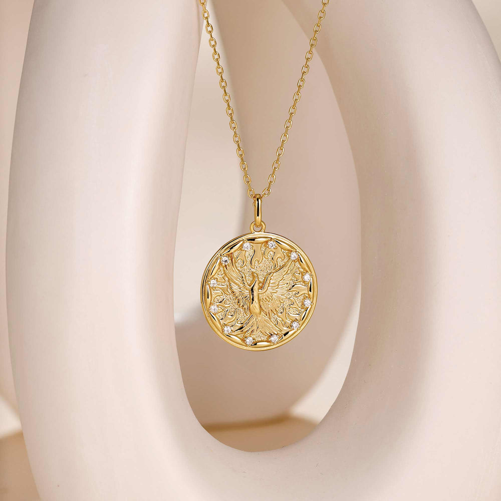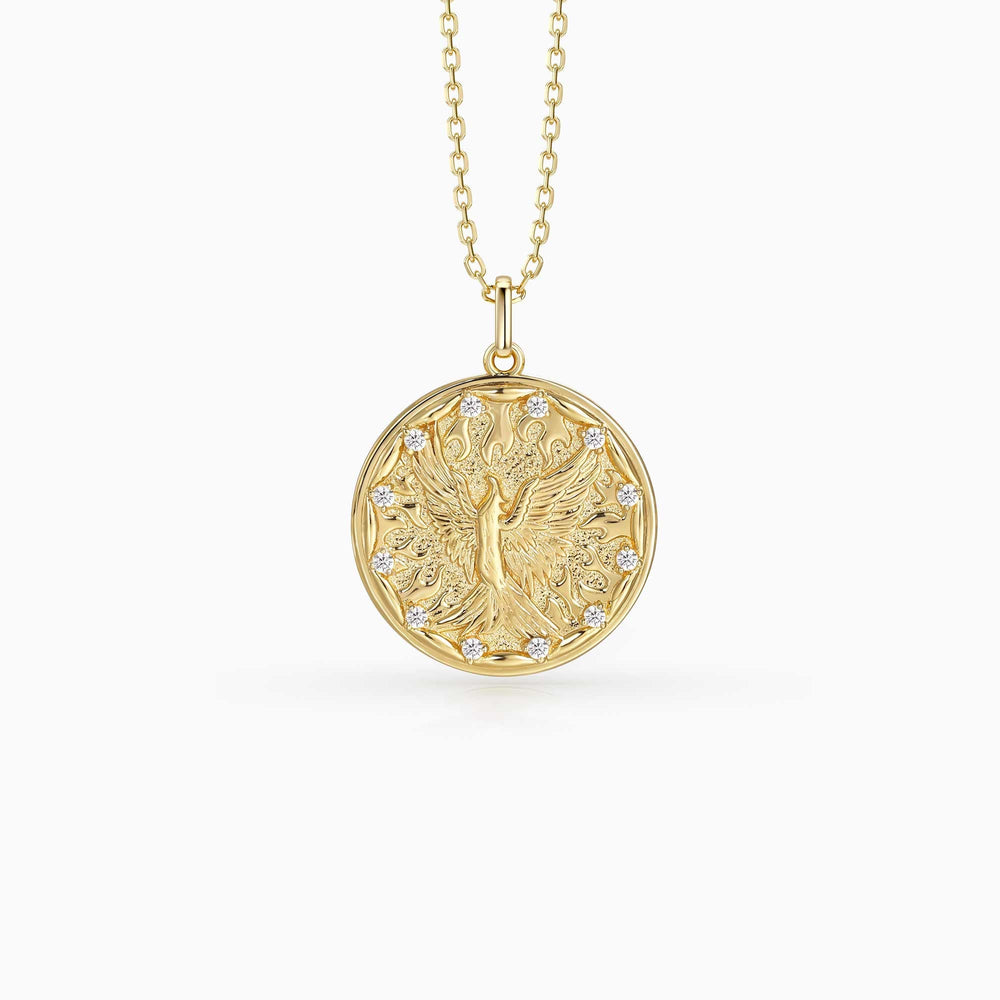 This medallion captures the moment of ascension—a phoenix rising in full flight, surrounded by a circle of radiant stones like embers turned to light. Each feather etched in motion, each flame dancing around its wings, this piece honors the beauty that comes after the burn.