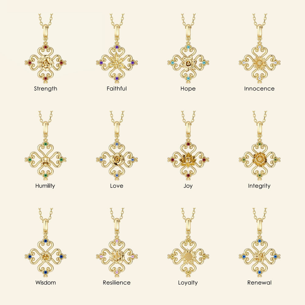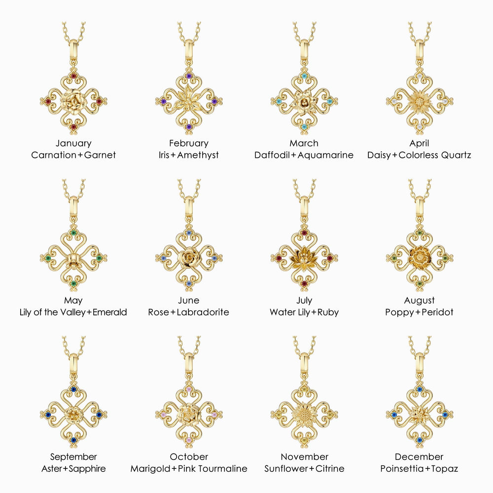 The Sacred Bloom Collection is a timeless celebration of faith, growth, and personal identity. At its heart, each pendant features a cross formed from four hearts, with a birth flower delicately positioned at the center of the cross. This design, paired with a corresponding birthstone, embodies the unique virtues and milestones that define each month.