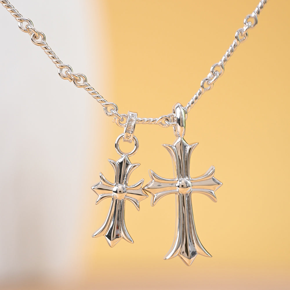 This dual cross heart pendant necklace carries profound spiritual meaning and timeless elegance. Designed to be worn together or separately, each cross shines with sacred symbolism, representing steadfast faith and endless blessings. Whether facing forward or backward, the pendant reveals divine beauty, reminding the wearer of strength, devotion, and grace. The double cross design reflects the sacred power of the cross, symbolizing unwavering belief and infinite blessings. Each side of the pendant carries a sense of divine presence, making it a versatile accessory filled with spiritual depth. More than jewelry, it is a testimony of faith and a blessing carried close to the heart.