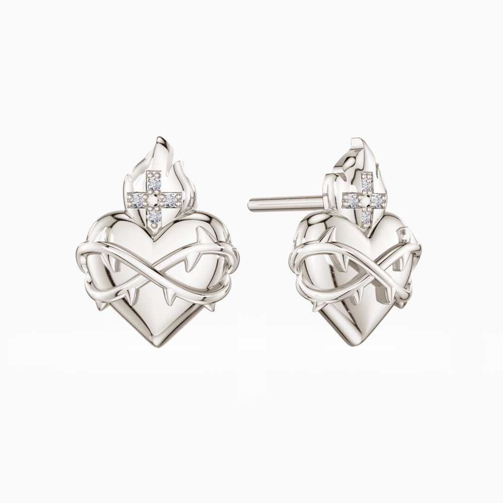 These Sacred Heart Flame Stud Earrings are a bold expression of unwavering love and devotion. At the center of each earring lies a radiant heart, encircled by a crown of thorns, symbolizing Christ’s sacrifice. The flames rise above the heart, representing the eternal love that burns brightly for humanity, while the intricately adorned cross, set with sparkling stones, serves as a symbol of faith and redemption.