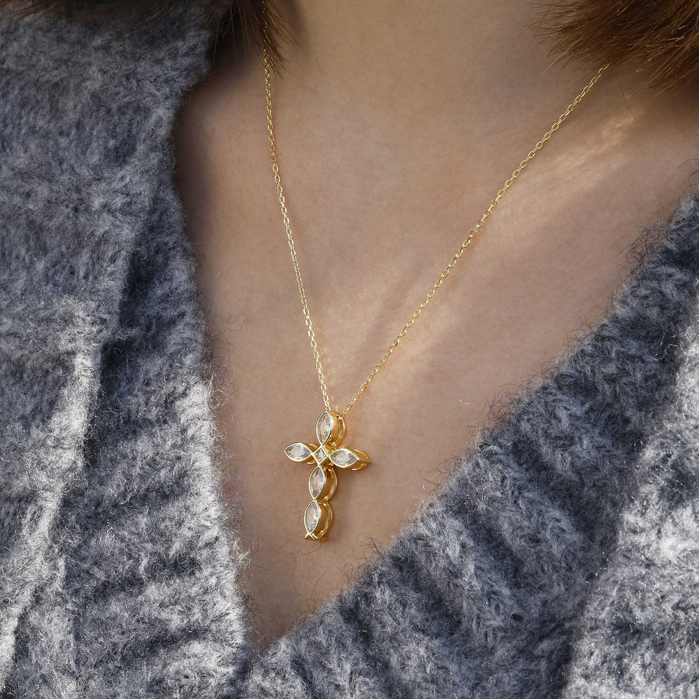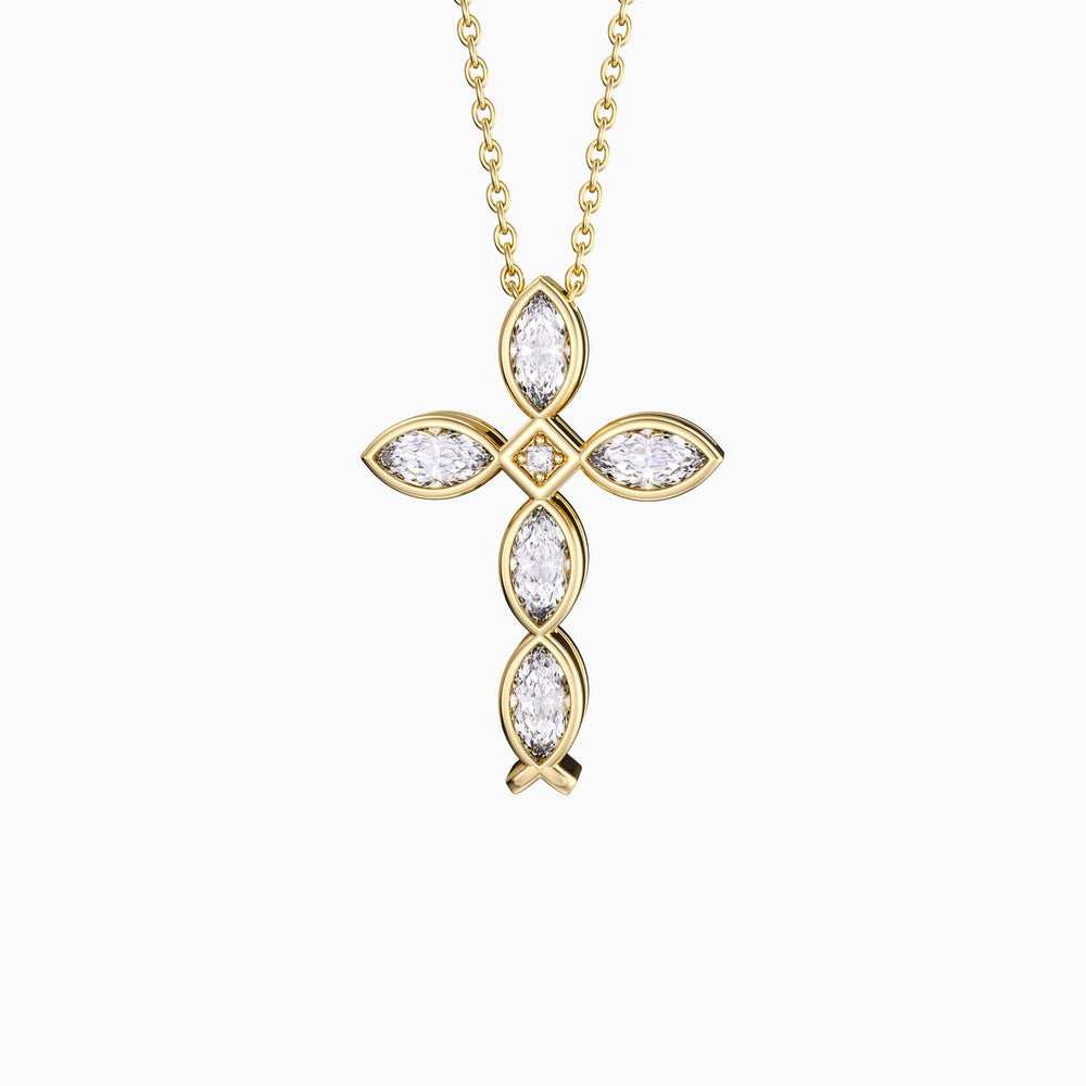 This exquisite necklace features a pendant that thoughtfully arranges the iconic Jesus fish motifs to form an elegant cross, a serene representation of faith intersecting with daily life. Each arm of the cross glimmers with precision-set stones, radiating outward like the morning sun's rays—a symbol of hope and renewal. Suspended from a delicate chain, the 'Lumina Faith' Pendant graces the wearer's neck with a touch of spiritual elegance and a whisper of divine presence. It is a testament to unwavering conviction, designed to be a beacon of comfort and a personal altar of devotion for anyone who holds their faith close to their heart.