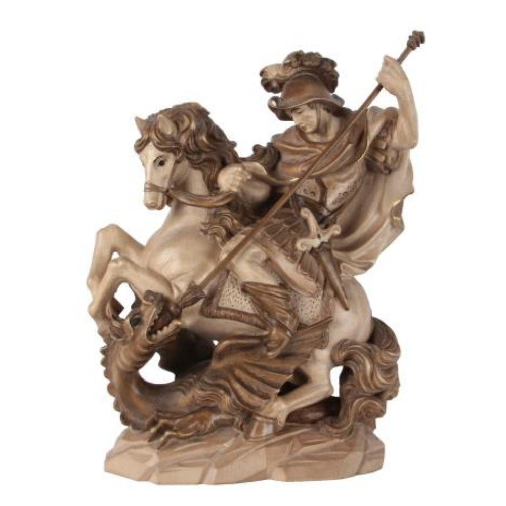 This sculpture is hand carved in selected Maple wood and hand painted by professional artists. This Saint George Statue is available in many sizes and finishes.
