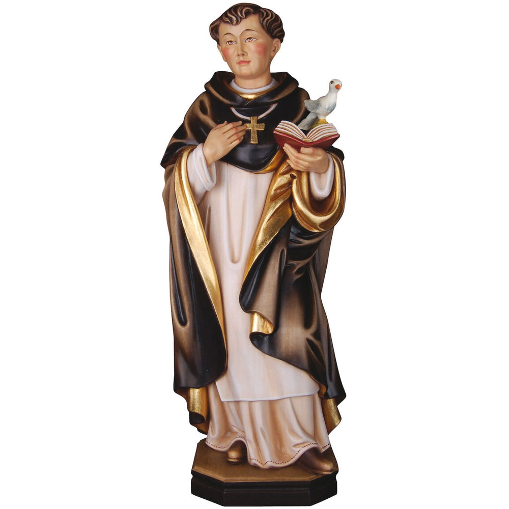 Imagery and Representation: shown as Dominic friar with a book and a dove. Hand carved in Maple wood and hand painted by professional artists. Made in Italy. Born in 1226, Thomas was the son of a Count of Aquino. When he was 5 he was placed in a Benedictine monastery. After he was able to make his own decisions, he went into the Order of St. Dominic and moved to Cologne to study and teach. He was a friend of French King St. Louis. He was one of the most influential theologians and was declared Doctor of the church in 1323.