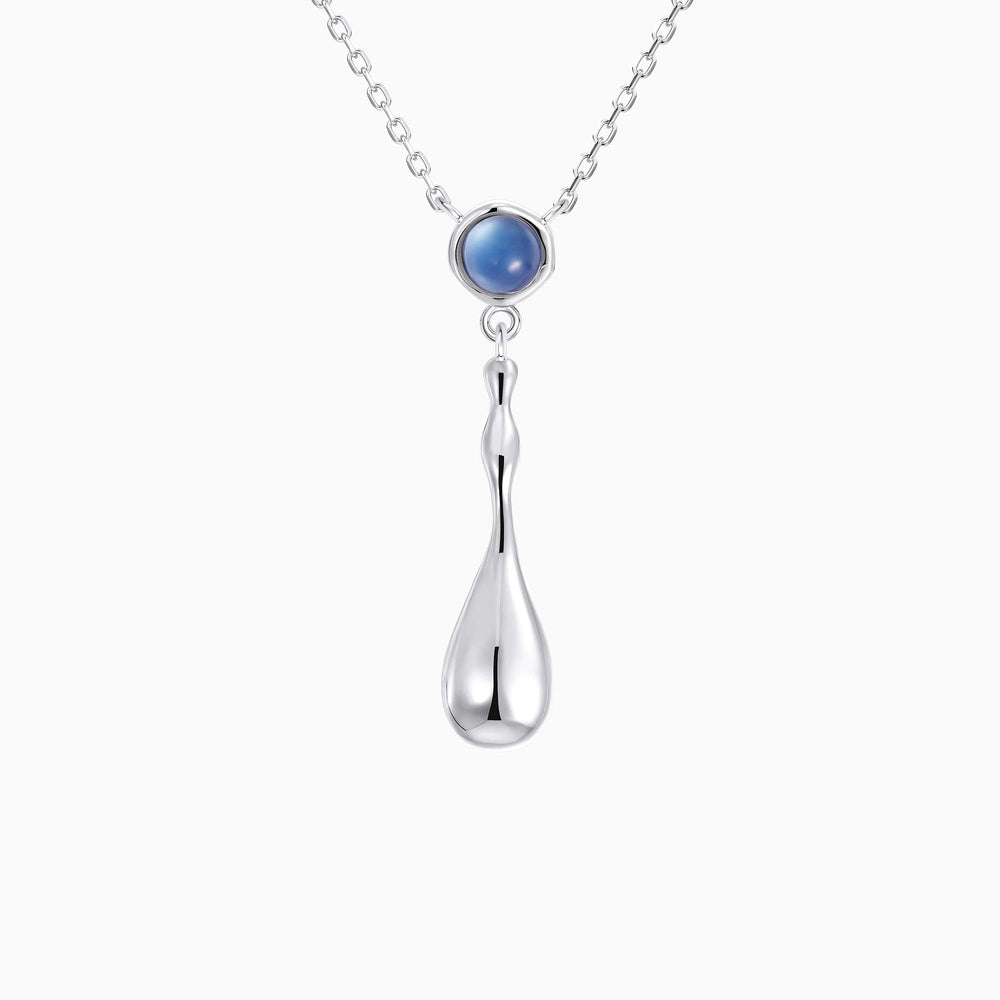 Above it, a round blue agate—long cherished for its calming, grounding energy—anchors the piece like a still point in a moving world. Together, the stone and droplet evoke balance, serenity, and strength in fluidity.