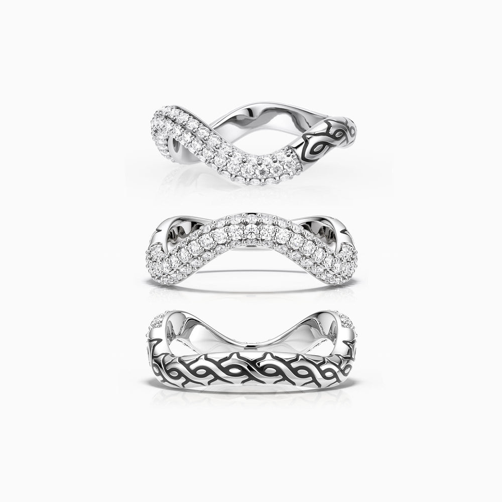This Pavé Wavy Enamel Statement Stacking Ring combines delicate sparkle with bold symbolism, creating a perfect harmony between elegance and resilience. One half of the ring is adorned with brilliant pavé-set stones, representing light and clarity, while the other half features the black enamel thorn motif, a symbol of protection and inner strength.