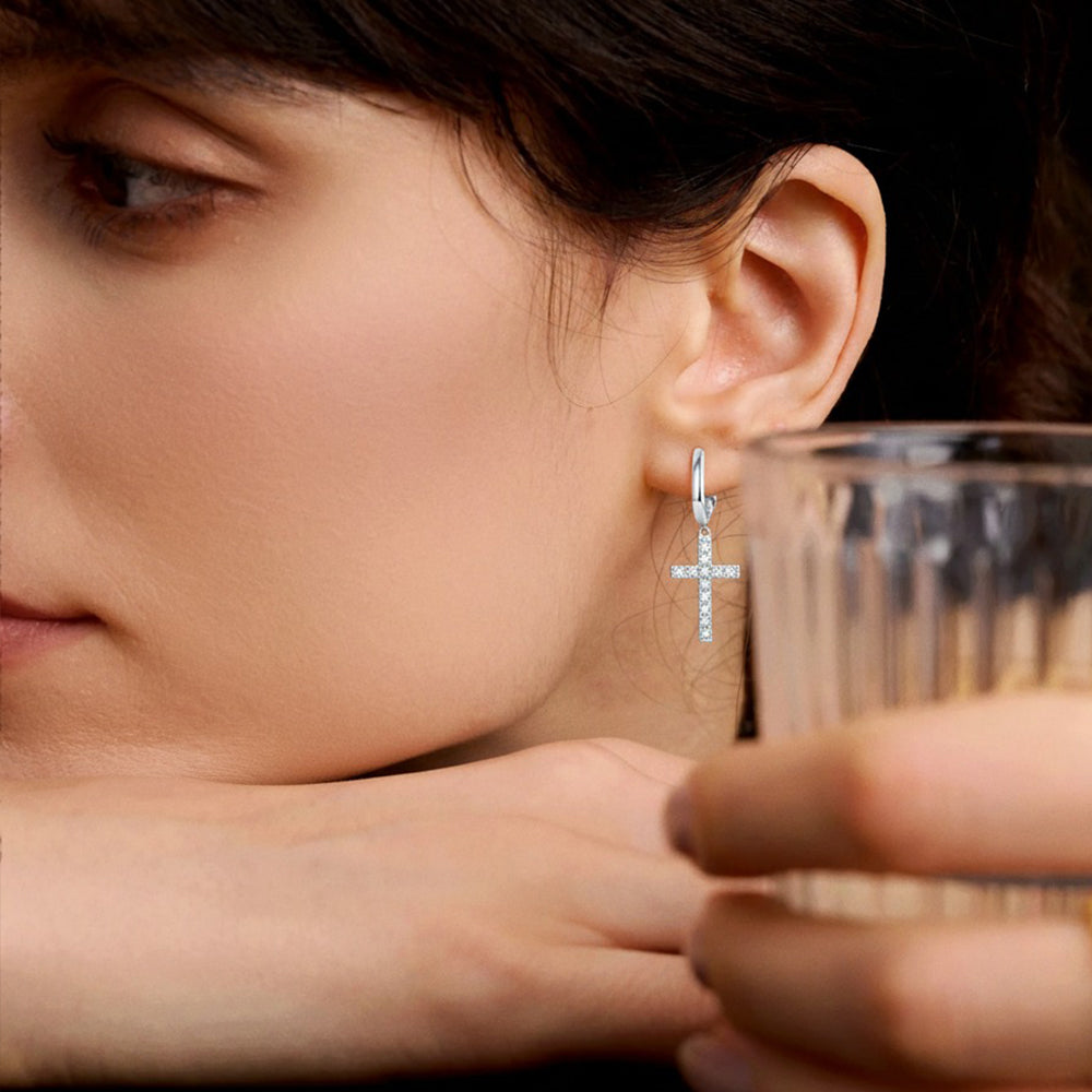 Inspired by contemporary minimalism and timeless faith, these huggie earrings pair a smooth, high-polish hoop with a fully pavé moissanite cross. The clean lines echo devotion and inner strength, while the precise prong-setting lets every facet catch the light—creating a bright, refined sparkle from any angle. Sized for effortless, all-day wear, they layer beautifully with other pieces or stand alone as a meaningful statement, making a thoughtful gift for celebrations, milestones, or daily encouragement.