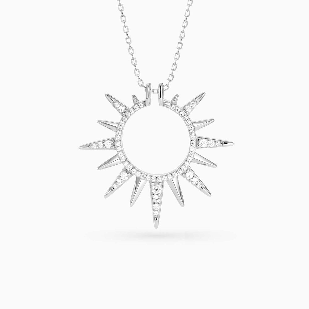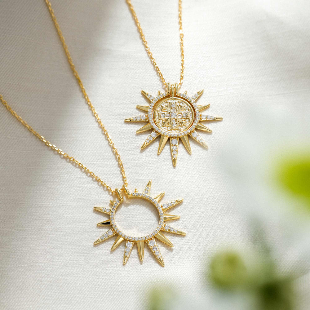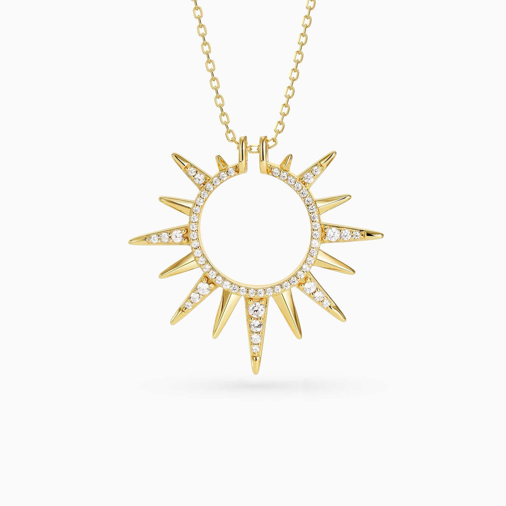A symbol of clarity, awakening, and divine strength, this radiant sunburst pendant features a circle of light framed by sculpted golden rays—each one set with shimmering stones to reflect your inner brilliance. The open center invites your story inward, while the bold silhouette sends your light outward.