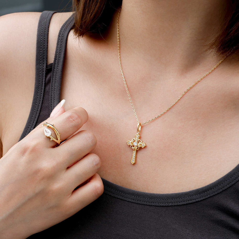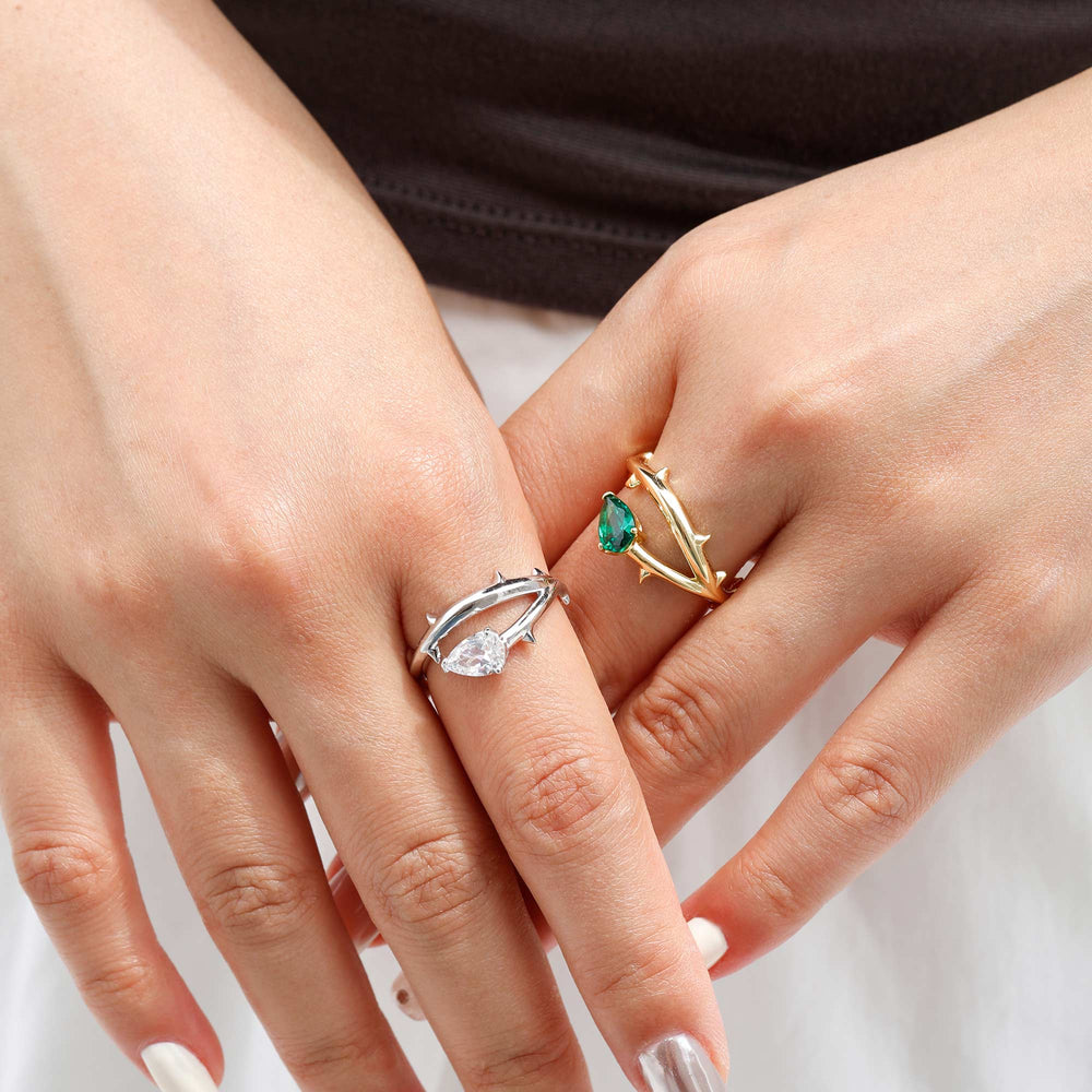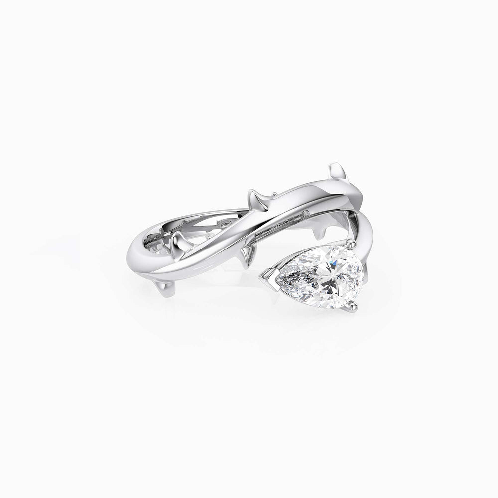 Bold yet refined, this sculptural ring wraps your finger in a golden crown of thorns—a symbol of quiet resilience and grace forged through adversity. At its center, a luminous pear-cut stone rises like a tear turned into light, framed by a wave-like arc that echoes your journey: layered, imperfect, and rising still.