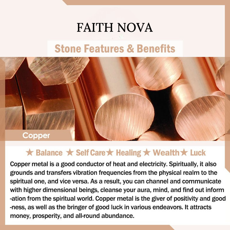 Copper metal is a good conductor of heat and electricity. Spiritually, it also grounds and transfers vibration frequencies from the physical realm to the spiritual one, and vice versa. As a result, you can channel and communicate with higher dimensional beings, cleanse your aura, mind, and find out information from the spiritual world. Copper metal is the giver of positivity and goodness, as well as the bringer of good luck in various endeavors. It attracts money, prosperity, and all-round abundance.