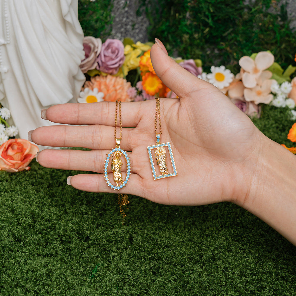 Each pendant features a detailed holy figure framed with turquoise stones, radiating serenity and divine protection.