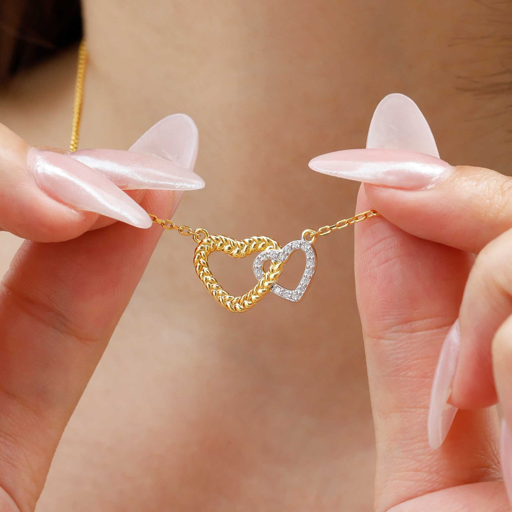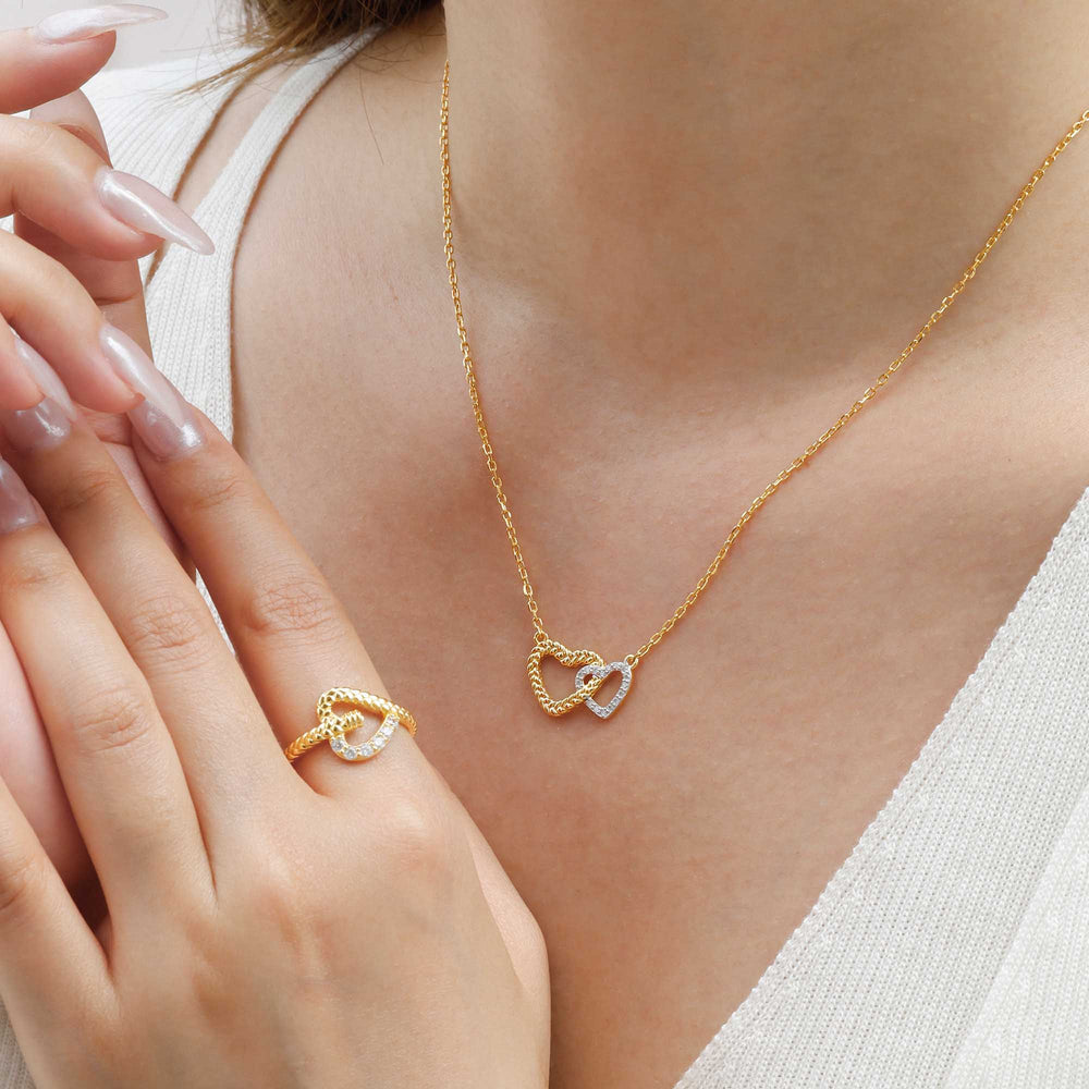 This meaningful double heart necklace is a tribute to bonds that are beautifully woven yet unbreakable. One heart features a braided texture inspired by “cord of three strands,” symbolizing unity, strength, and resilience. The other sparkles with pavé-set stones, capturing light and representing the love that uplifts and illuminates.