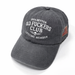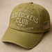 The front embroidery features a playful, tongue-in-cheek club slogan paired with a winged skull motif, giving the cap a distinctive vintage feel. A faded American flag patch on the side adds a rugged, classic accent that complements the washed cotton fabric.