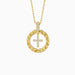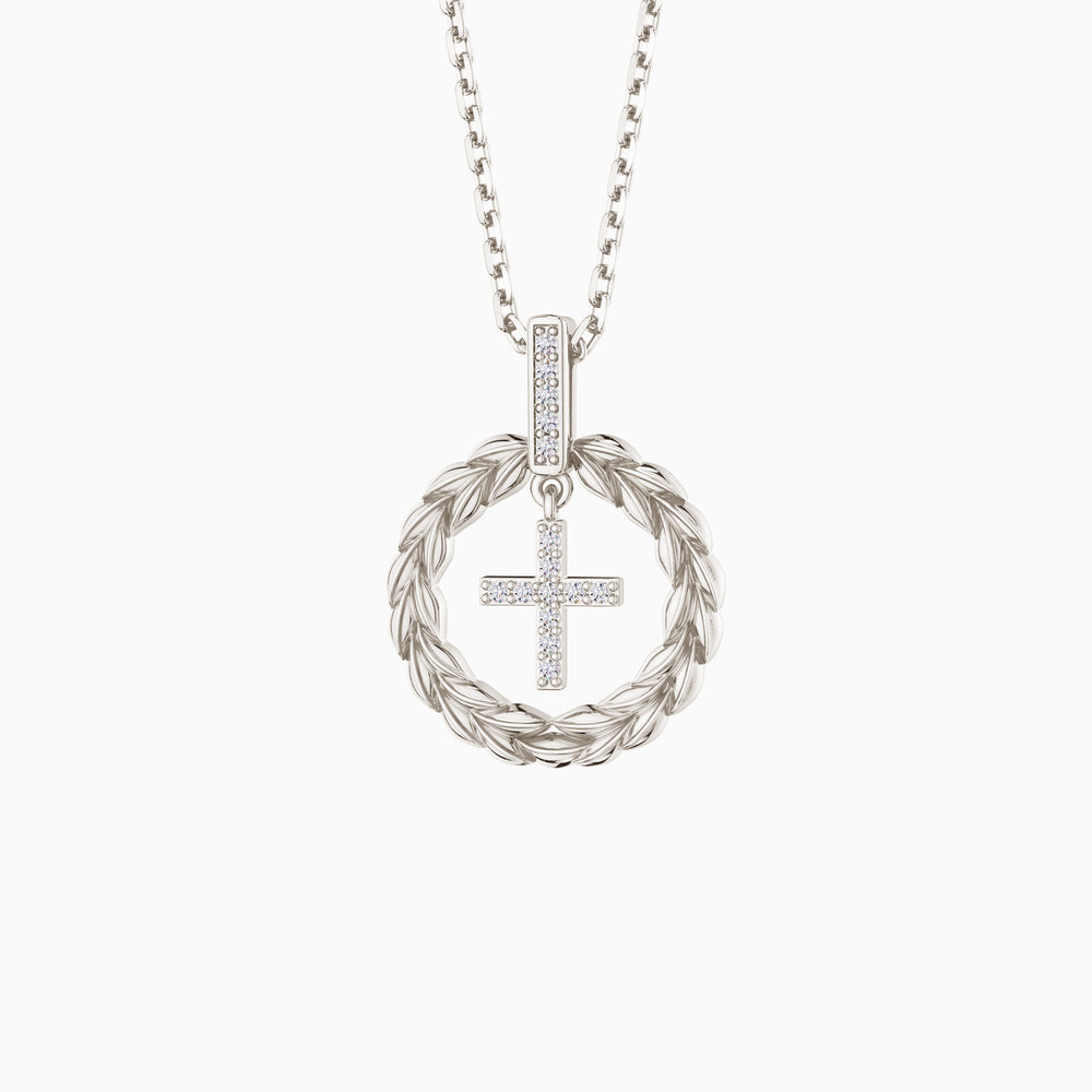 At the center, a radiant cross, embellished with sparkling stones, dangles freely, adding movement and light to the piece. The cross serves as a symbol of hope and faith, beautifully suspended within the embrace of the wheat wreath. The bail, also adorned with stones, adds a touch of elegance, completing this design that carries both a spiritual message and natural beauty.
