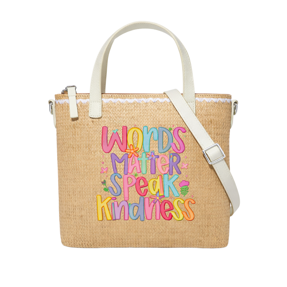 This christian faith straw crossbody tote bag features a “ Words Matter Speak Kindness ” design. Crafted with a structured straw-textured exterior, it offers a spacious interior, sturdy top handles, and a detachable shoulder strap for versatile everyday use. Perfect for Easter, church gatherings, beach days, or daily errands, this lightweight yet durable bag lets you carry your essentials — and your faith — wherever you go.